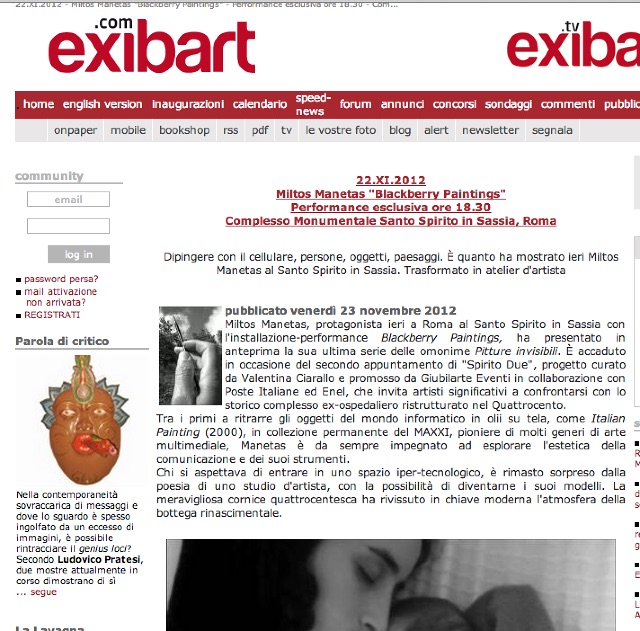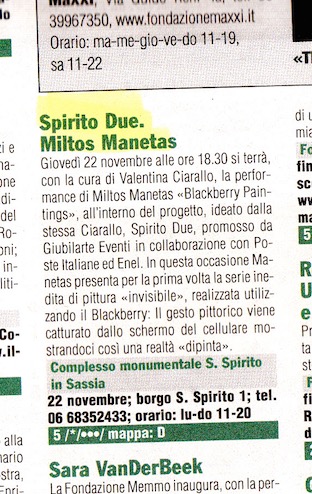 Miltos Manetas, protagonista ieri a Roma al Santo Spirito in Sassia con l'installazione-performance Blackberry Paintings, ha presentato in anteprima la sua ultima serie delle omonime Pitture invisibili. È accaduto in occasione del secondo appuntamento di "Spirito Due", progetto curato da Valentina Ciarallo e promosso da Giubilarte Eventi in collaborazione con Poste Italiane ed Enel, che invita artisti significativi a confrontarsi con lo storico complesso ex-ospedaliero ristrutturato nel Quattrocento.