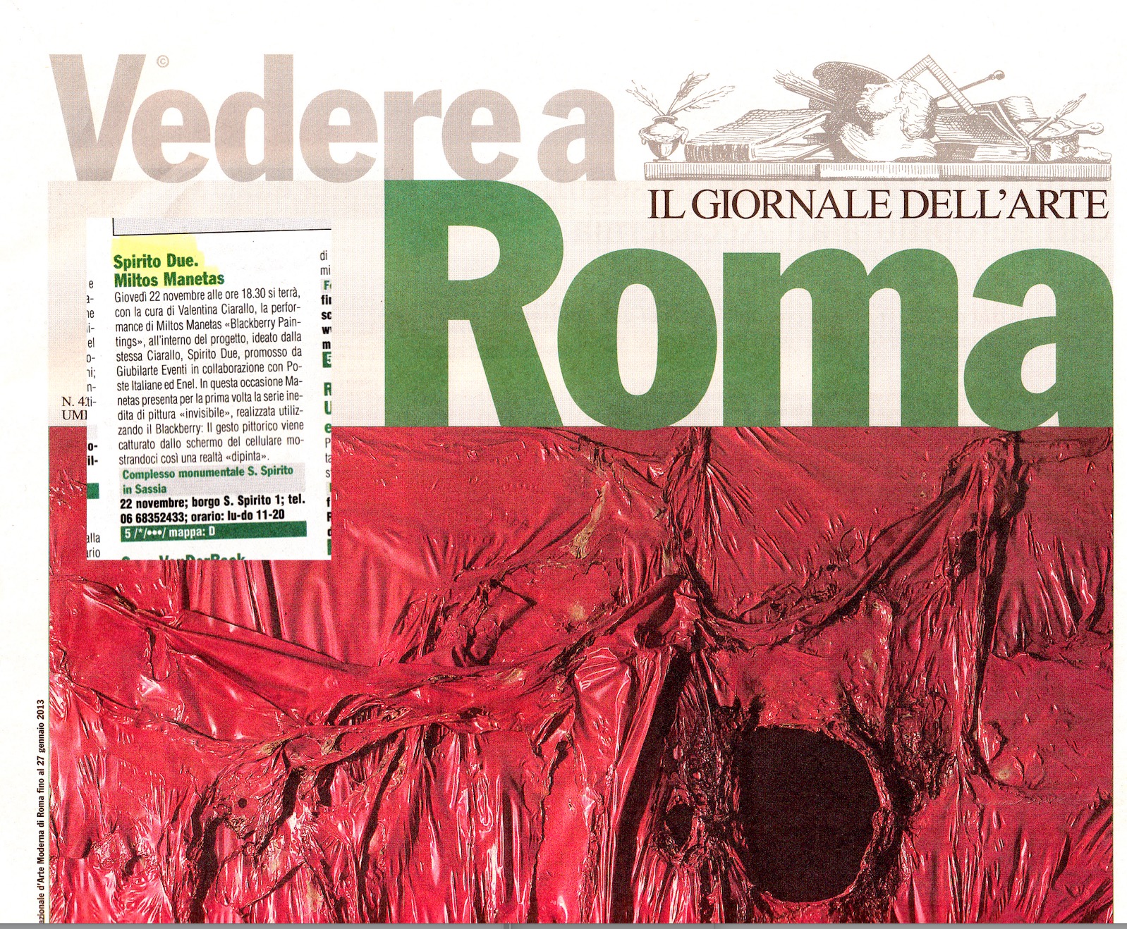 Sono due gli appuntamenti a Roma con l’artista greco Miltos Manetas, definito lo psicologo “post-contemporaneo”: il primo, il 22 novembre 2012 alle ore 19:00 al Complesso Monumentale di Santo Spirito in Sassia, (Borgo S. Spirito, 2) nel corso del quale Manetas eseguirà una performance per il progetto SPIRITO DUE, a cura di Valentina Ciarallo. Il secondo, mercoledì 28 novembre 2012 alle ore 19:00 al MACRO, dove Manetas presenterà il progetto speciale After BlackBerry Paintings. (In esposizione al MACRO di Via Nizza dal 29 novembre 2012 al 30 dicembre 2013).